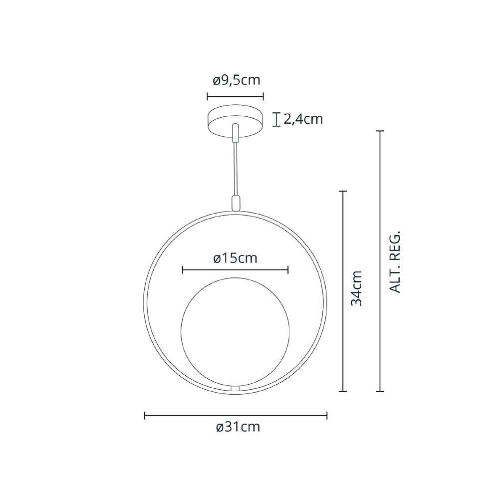 Dentro de la sección Lámparas Varios, les presentamos el artículo colgante AIMEE. Las dimensiones de este modelo de colgante son de altura ajustable, 31 cm de diámetro, en oro. Este modelo necesita 1 bombilla E27.