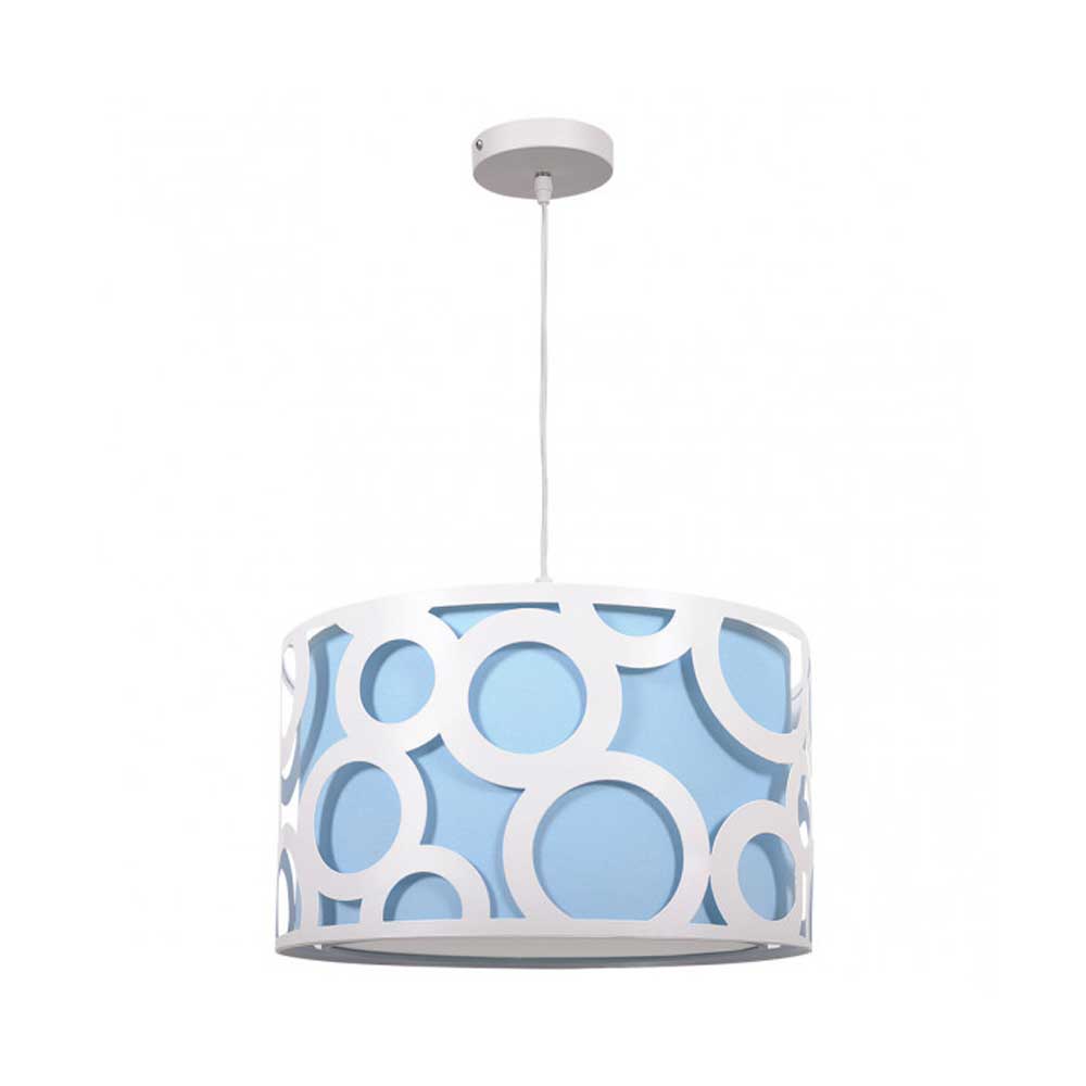 Lámpara colgante infantil modelo Orlando. Doble anillo, el exterior es metálico, troquelado con círculos en color blanco, y el interior es de material textil disponible en varios colores lisos: Rosa, Violeta claro (Lila) y Azul celeste. Ideal para dormitorios juveniles/infantiles y espacios de niños y niñas.