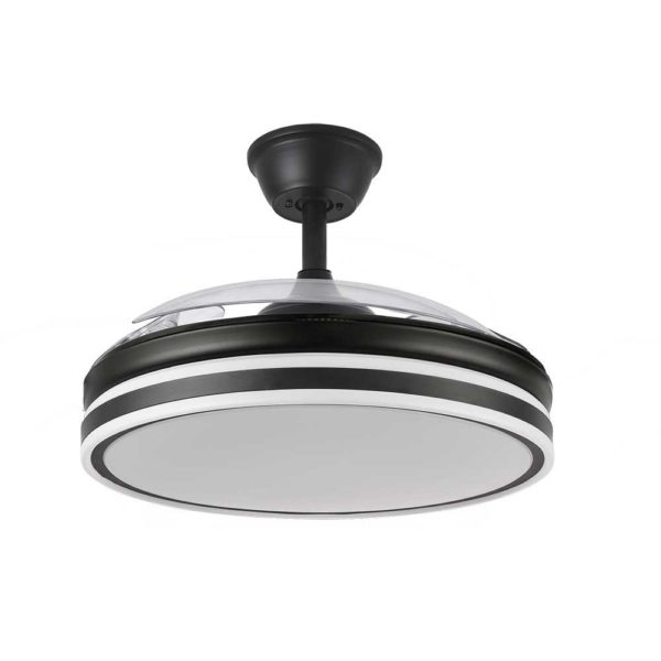 Ventilador BAYOMO realizado en metal y policarbonato, en color NEGRO con tres aspas DESPLEGABLES de ABS transparente muy resistentes. Motor DC. Tiene seis velocidades ajustables. Tecnología LED integrada con una potencia de 72W, con 3 TEMPERATURAS DE LUZ (3000-4000-6000K) y 6120 lúmenes. Control de aire verano o invierno. Su medida es de 32/47X49X49 centímetros con las aspas plegadas y de 32/47X108X108 centímetros con las aspas desplegadas, con dos medidas de tija para instalarlo a diferentes alturas. Mando a distancia INCLUIDO con MEMORIA DE COLOR incorporada y TEMPORIZADOR 1/2/4 H. Modelo disponible en color Níquel, Cuero, Blanco y en color Negro.