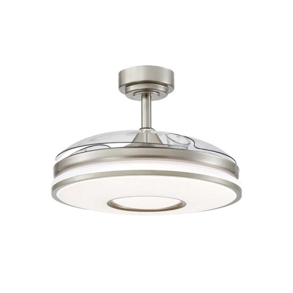 Ventilador DC serie DANI realizado en metal, policarbonato y metacrilato, en color CROMO con cuatro aspas DESPLEGABLES de metacrilato transparente muy resistentes. Tiene seis velocidades ajustables. Tecnología LED integrada con una potencia de 72W, co…