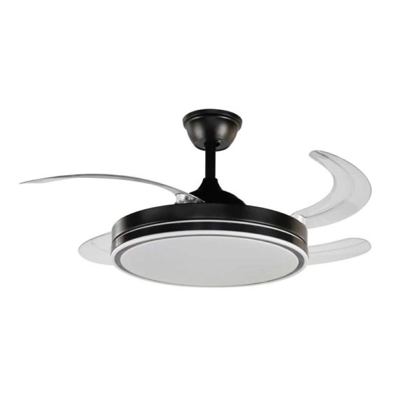 Ventilador de techo con luz led y mando a distancia de aspas retráctiles modelo TRACE. Motor DC con 5 AÑOS de GARANTÍA, de bajo consumo y silencioso. Diseño sencillo con un amplio difusor de luz de luz que simula una lámpara de plafón. Cuando se activa el ventilador se abren las aspas transparente, por lo que no se aprecian en ningún momento. Para salones, dormitorios, salas de espera, halls, etc.