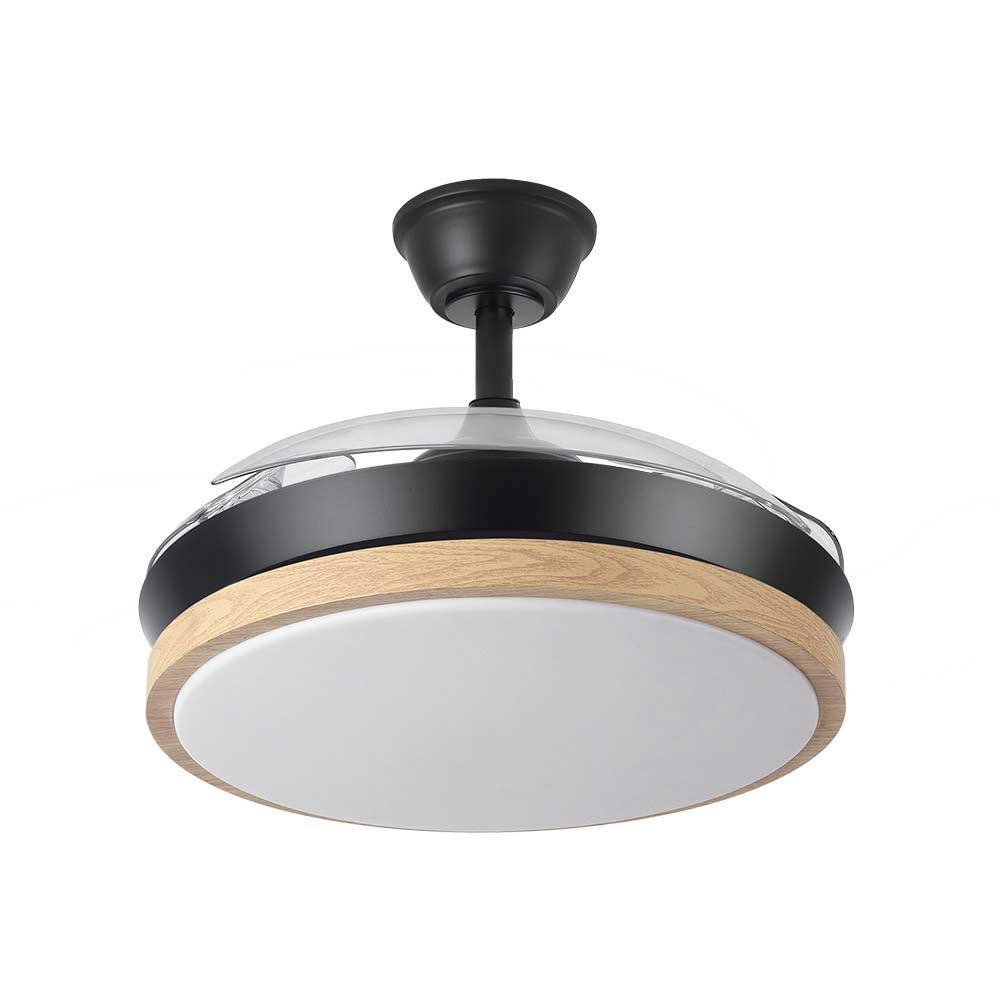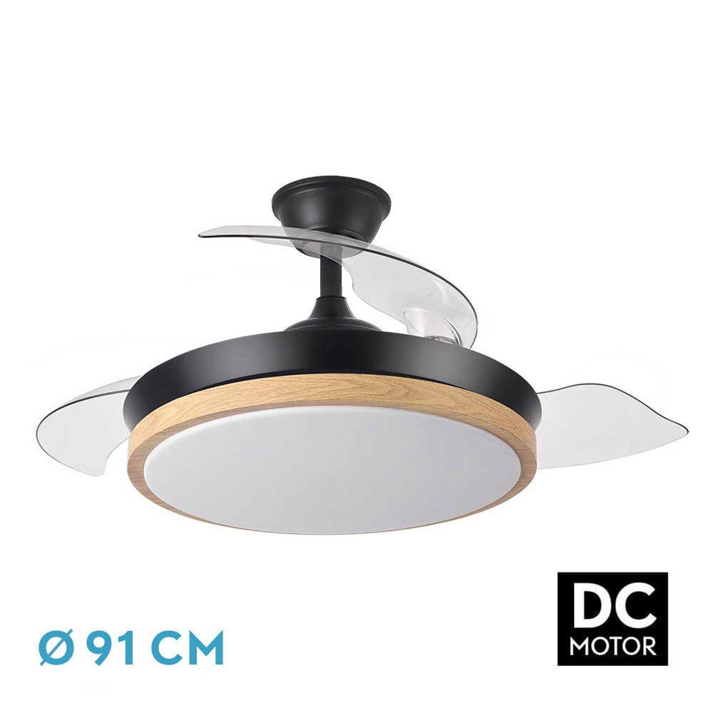 Ventilador DC de la serie EVROS realizado en metal, policarbonato y ABS, en color NEGRO/HAYA con tres aspas DESPLEGABLES de ABS transparente muy resistentes. Tiene seis velocidades ajustables. Tecnología LED integrada con una potencia de 72W, con 3 TEMPERATURAS SELECCIONABLES DE LUZ (3000-4000-6000K) y 6120 lúmenes. Control de aire verano o invierno. Su medida es de 32/47X40 centímetros con las aspas plegadas y de 32/47X91 centímetros con las aspas desplegadas. Incluye dos tijas de 10 y 25 centímetros, para colocar a distintas alturas. Mando a distancia INCLUIDO con MEMORIA DE COLOR incorporada y TEMPORIZADOR 1/2/4 H. Disponibles en esta serie en blanco/haya y en negro/haya y en dos tamaños diferentes.