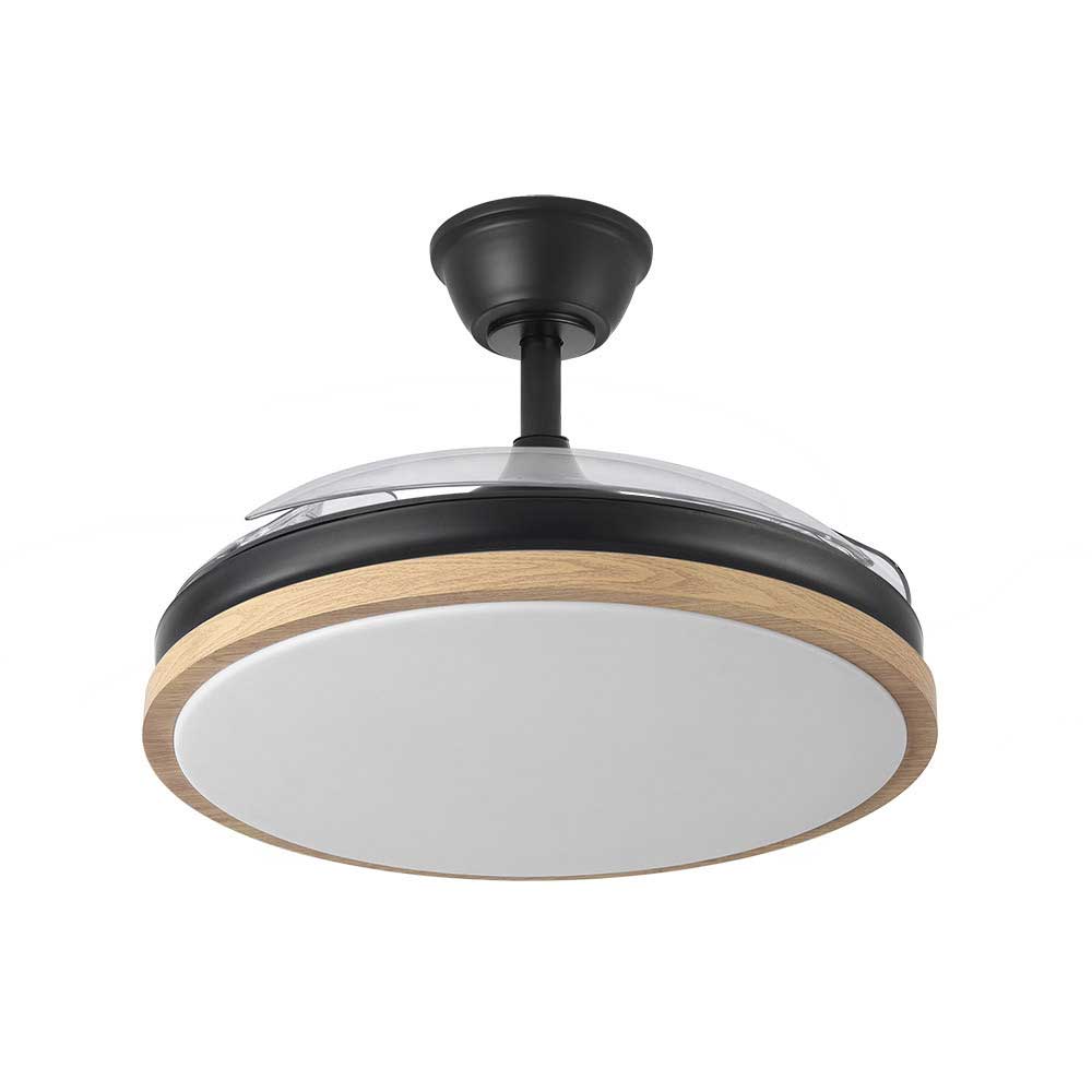 Ventilador DC de la serie EVROS realizado en metal, policarbonato y ABS, en color NEGRO/HAYA con tres aspas DESPLEGABLES de ABS transparente muy resistentes. Tiene seis velocidades ajustables. Tecnología LED integrada con una potencia de 59W, con 3 TEMPERATURAS SELECCIONABLES DE LUZ (3000-4000-6000K) y 6120 lúmenes. Control de aire verano o invierno. Su medida es de 32/47X50 centímetros con las aspas plegadas y de 32/47X107 centímetros con las aspas desplegadas. Incluye dos tijas de 10 y 25 centímetros, para colocar a distintas alturas. Mando a distancia INCLUIDO con MEMORIA DE COLOR incorporada y TEMPORIZADOR 1/2/4 H. Modelo disponible en blanco/haya y en negro/haya y en dos tamaños.