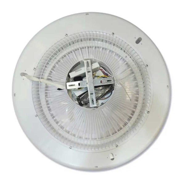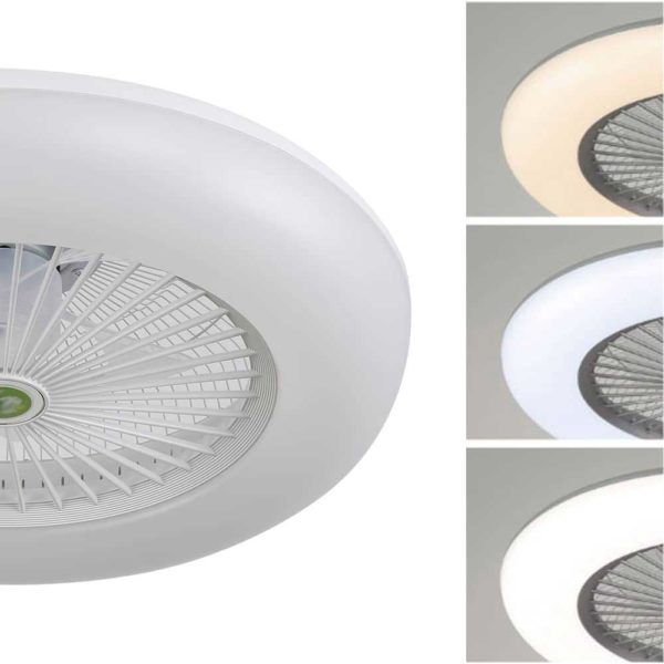 Lámpara de plafón con ventilador, luz led y mando a distancia incluido Modelo IKARO DC BLANCO. Simula una lámpara de plafón normal que integra un ventilador con las aspas ocultas. Es ideal para techos bajos, estancias pequeñas y dormitorios infantiles por ser muy seguro al estar las aspas protegidas. Motor DC: menor consumo y más silencioso. También puede seleccionarse la tonalidad de la luz según el momento del día, con 3 temperaturas de luz disponibles y regulable en intensidad. Con memoria de luz. Función Verano/Invierno, es decir, con inversión de giro para invertir la circulación del aire.