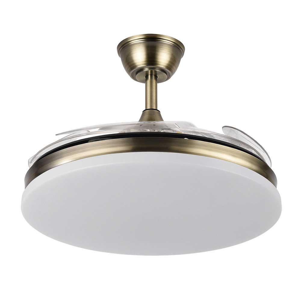 Ventilador DC de la serie TRIDENTE realizado en metal, policarbonato y ABS, en color CUERO con cuatro aspas DESPLEGABLES de ABS transparente muy resistentes. De diseño innovador, ideal para completar tanto en decoraciones modernas como clásicas, real…